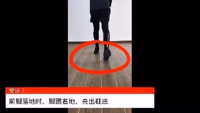 ②前腳落地的時候,腳跟要輕盈地著地,鞋底向前亮出。