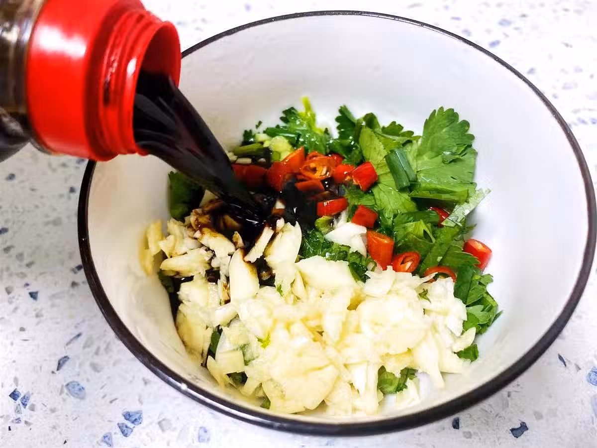 第5步:蔥花,香菜,蒜米,小米辣,分別切好放在一個味碟里,然後淋入滾燙的食用油,激發出香料的全部香味之後,再加入適量的生抽以及蠔油攪拌均勻,那麼我們的味碟也就做好了。