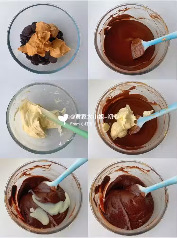 【1】將230g的花生醬和200g的黑巧克力一起倒入乾淨的碗裡並隔著熱水融化。