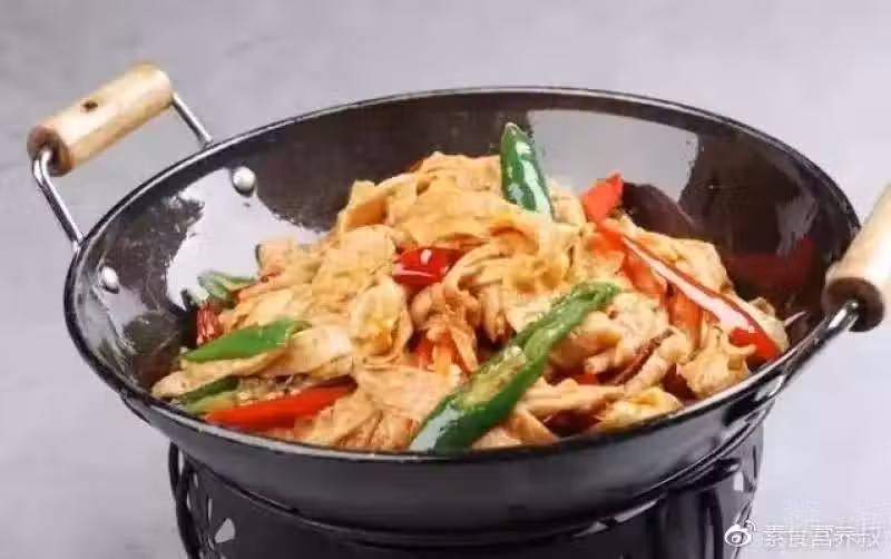3、炒鍋里加適量油,加入花椒、八角、香葉、一半青辣椒、一半紅辣椒,加入炸好的豆腐皮翻炒。