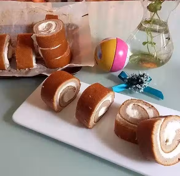 蛋白中加入白糖打發,分三次放入蛋黃糊中上下翻拌均勻。蛋糕模具中鋪上油紙,倒入混合好的蛋糕糊輕震幾下。烤箱預熱165度,烤20分鐘。取出倒扣在油紙上晾涼,擠上打發好的奶油捲成卷切成塊,裝入盤中即可食用。