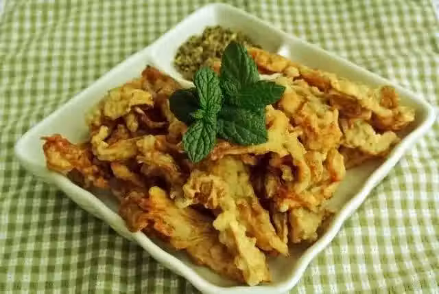 7、待油溫升高,下入蘑菇復炸一次,變色後馬上撈起,控油(或用廚房專用紙吸油)後裝盤;