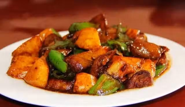 9、炸好的土豆塊和茄塊倒進去,翻炒均勻;