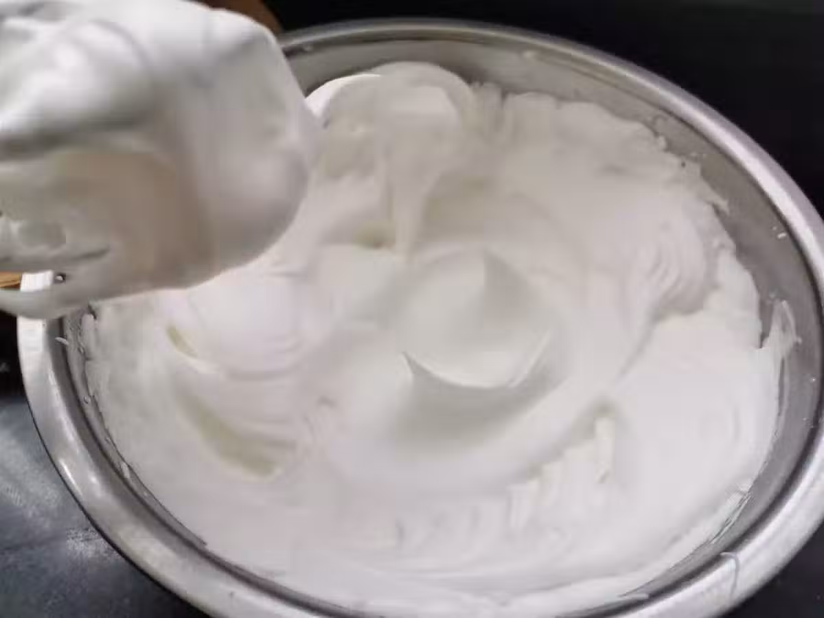 5、將三分之一的蛋清加入到蛋黃糊中,用炒菜的手法拌勻,再倒入三分之一蛋清拌勻,最後反過來將拌好的麵糊倒入到剩下的蛋清中,拌勻。