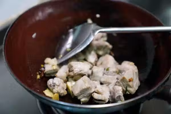 5.炒鍋燒熱,將瀝干水分的排骨放在裡面用中火翻炒一下。翻炒至表面焦黃,把裡面多餘的水分炒出來。然後放入配料炒香。配料炒香後,直接倒入提前準備好的糖醋汁。大火翻炒均勻。