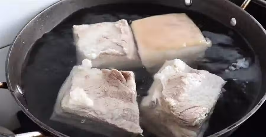 4。炒鍋中加入適量的清水,將切開的五花肉放在冷水鍋中。在裡面放入老薑一塊,大蔥一根,放入料酒幾滴去腥。不用蓋蓋子將其大火煮開。水燒開之後撇去裡面的浮沫。繼續用大火煮5分鐘。五分鐘之後將其撈出放在冷水中洗乾淨備用。