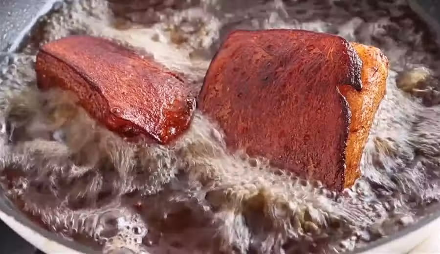 8。這時候我們在將五花肉翻過來繼續油炸一遍,將五花肉炸至表面色澤金黃的時候就可以撈出來了。將炸好的五花肉放在冷水中浸泡十分鐘。