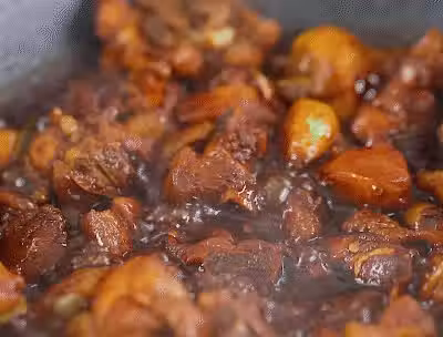 6、倒入調好的料汁,翻勻中小火燜10分鐘。