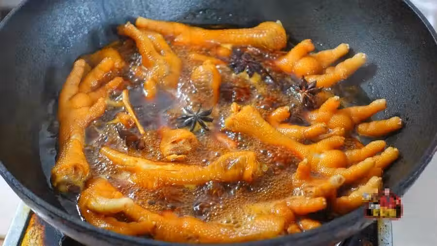 第五步:煮15分鐘左右,鍋里的湯汁所剩不多了,這時揭開鍋蓋,趁雞爪不注意,加入1茶匙食鹽,然後轉成大火翻炒收汁,等湯汁收濃裹到雞爪上時,即可出鍋裝盤!