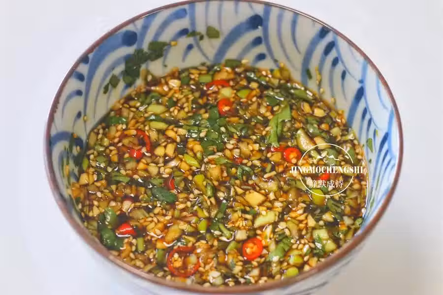 4、抓一小把炒熟的白芝麻放進去,再加入適量的涼白開(不然這碗蘸汁過於濃厚而且會咸),攪拌均勻,我們的萬能蘸汁就做好了。無酸不爽的朋友可以酌情加入少許醋,白糖就不必了,因為蠔油比白糖鮮多了。