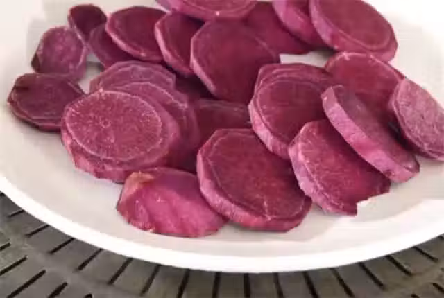 1.準備三個紫薯洗乾淨去皮,切片後放入盤中,水開後蒸上15分鐘,多吃紫薯,可以增強免疫力。