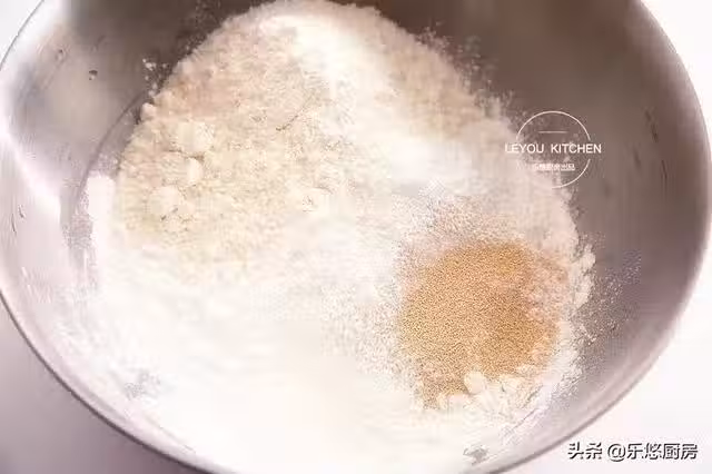 第一步:把粘米粉、普通麵粉、酵母粉、白糖一起放到盆中,如圖。