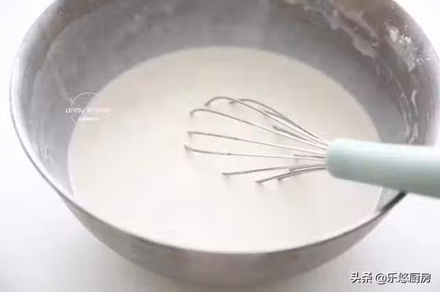 第三步:用手動打蛋器把麵糊攪拌成沒有顆粒的狀態,如圖,麵糊攪拌好以後,大概比酸奶稍更濃稠一些,提起打蛋器,掉落的紋路不會馬上消失。然後蓋上保鮮膜,放到溫暖的地方發酵30分鐘。