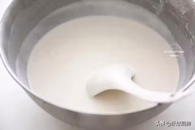 第四步:發酵好後,麵糊的體積會變大,用勺子翻動一下,可以看到裡面有很多小孔,也可以聞到酸味。然後用勺子再次攪動,攪動至體積變小,氣泡也越來越少。這一步是給麵糊排氣。