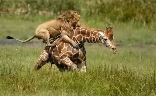 12.雄獅正在捕食長頸鹿。明朝時,我國通過海運喜提一隻麒麟,那隻麒麟其實就是長頸鹿。