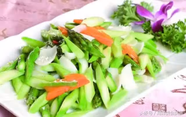 2、蘆筍、百合焯水,一放入開水即可撈出,放入涼水(主要是斷生即可)。