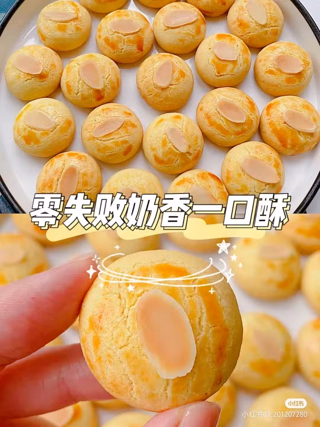 2️⃣篩入低筋麵粉和奶粉,攪拌成團,然後分成9克一個,團成圓形,輕輕壓扁放在烤盤上,表面刷一層蛋黃液,放一片杏仁片,放入預熱好的烤箱170度烤20分鐘,放涼可以吃嘍,香酥掉渣奶香一口酥,快去試試呀。