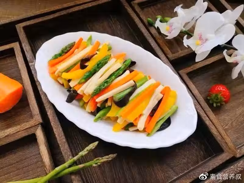 2. 黃椒洗凈去籽切細條,長短和紅蘿蔔一致。3. 杏鮑菇同樣洗凈切條,蘆筍洗凈滾刀切條。4. 熱鍋倒油,冷油放紅蘿蔔翻炒2分鐘,起鍋備用。5. 鍋中倒少許油,放黃椒,再放杏鮑菇翻炒2~3分鐘。6. 倒入木耳、蘆筍翻炒。7. 倒入提前翻炒過的紅蘿蔔,翻炒3分鐘左右。8. 加入鹽、蔬果粉炒勻即可。