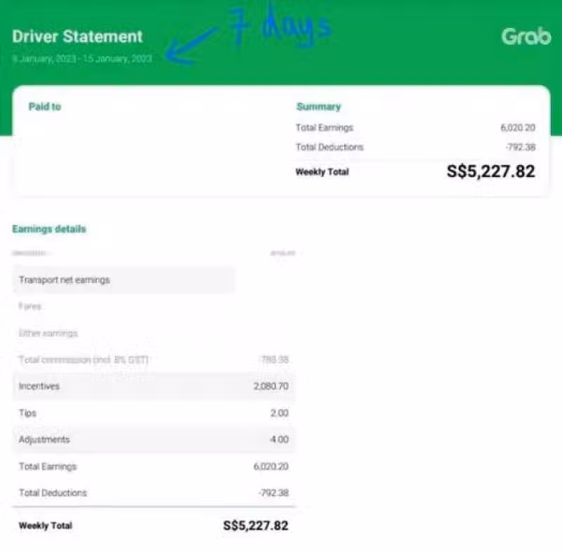 根據Beh Chia Lor-Singapore Road在面子書頁面上轉載的截圖,這名司機在本月9日至15日的一周內,賺了6020.20新元,包括2080.70新元(約6866令吉31仙)的獎勵和2新元(約6令吉60仙)的小費。若扣除支付給Grab的佣金以及總額4新元(約13令吉20仙)的「調整」,這名司機這一周的凈收入為5227.82新元(約1萬7251令吉81仙)。但是,這尚未扣除司機的成本,例如租車費、加油費、停車費等。