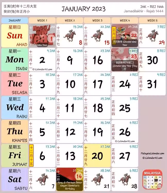 1 Jan : Ahad : Tahun Baru 2023 (New Year) : Semua negeri. kecuali Kelantan, Kedah, Perlis, Johor dan Terengganu