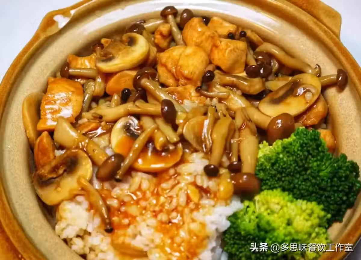 4:菌菇炒熟,加點鹽,半勺蚝油調味;調個澱粉水+半勺生抽,倒入雞肉翻炒均勻,倒入澱粉水勾芡收汁,澆到米飯上~~