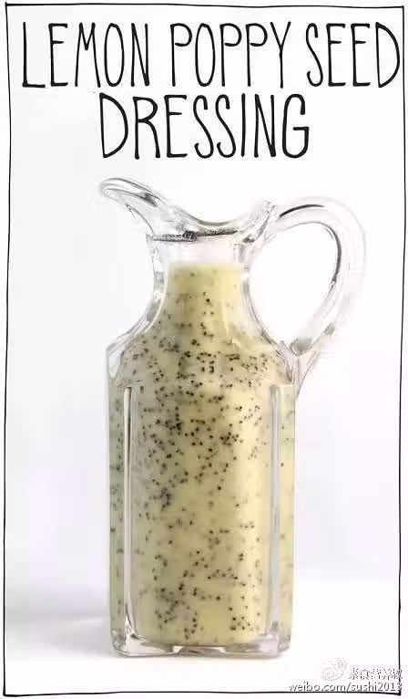 食材:橄欖油100ml、檸檬汁45ml、第戎芥末醬15ml、罌粟籽15g、楓糖漿15ml