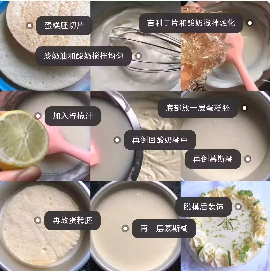 5.】冷藏好的蛋糕用熱毛巾熱敷脫模,表面用60g淡奶油加糖打發裝飾,放上檸檬片、些許檸檬皮屑、薄荷裝飾就可以啦~~