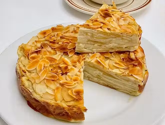 今天給大家分享一款超級簡單的法式蘋果千層蛋糕做法,低油低脂又有營養,千層指的是裡面層次分明的蘋果片喔,蛋糕表面鋪滿了杏仁片,烘焙過後口感細膩,香氣誘人,快來一起試試吧!