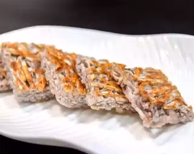 3. 用刀切塊,然後放入煎盤煎至兩面金黃色,出鍋擺盤即可。