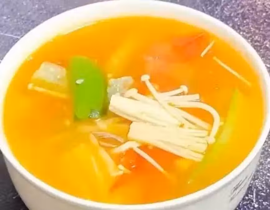 食材:南瓜、荷蘭豆、金針菇、雞高湯、水、鹽