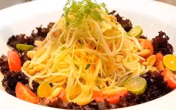 5.青木瓜絲中,倒入冰糖水、辣椒、醬油、檸檬汁攪拌,
