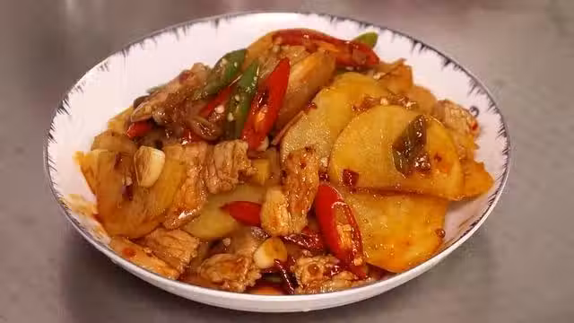 食材 :土豆2個,青椒1個,五花肉100克,料酒1勺,白鬍椒粉1/3勺,生抽1勺,蔥姜蒜適量,澱粉1/3勺大料,1個,雞精少許