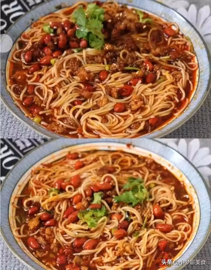 ③調醬汁:碗里放入三勺辣椒油,一勺生抽,一勺陳醋,兩勺姜蒜水,半勺花椒粉,一勺芝麻醬,一勺麵湯攪拌均勻。然後把醬汁淋到麵條上即可。