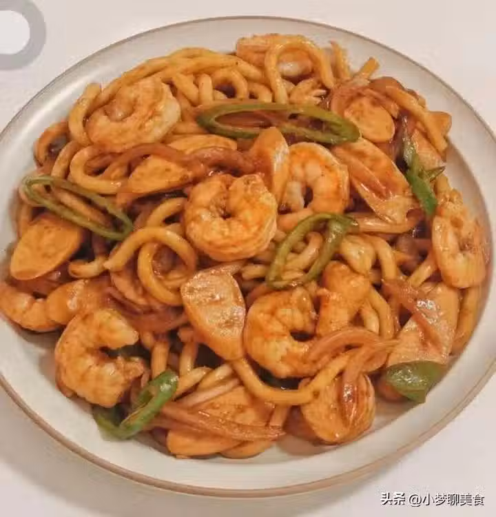 ★食材:烏冬面、青椒、蝦仁、火腿、料酒、生抽、蚝油、醋、鹽、雞精、黑胡椒。
