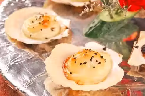 4、把扇貝肉用少許鹽和白鬍椒粉簡單調味後放在扇貝殼上,蛋黃醬用圓嘴花袋擠在扇貝肉上,入預熱的烤箱用180度烤20分鐘即可取出裝盤,最後撒上少許已炒香的黑芝麻,上桌。
