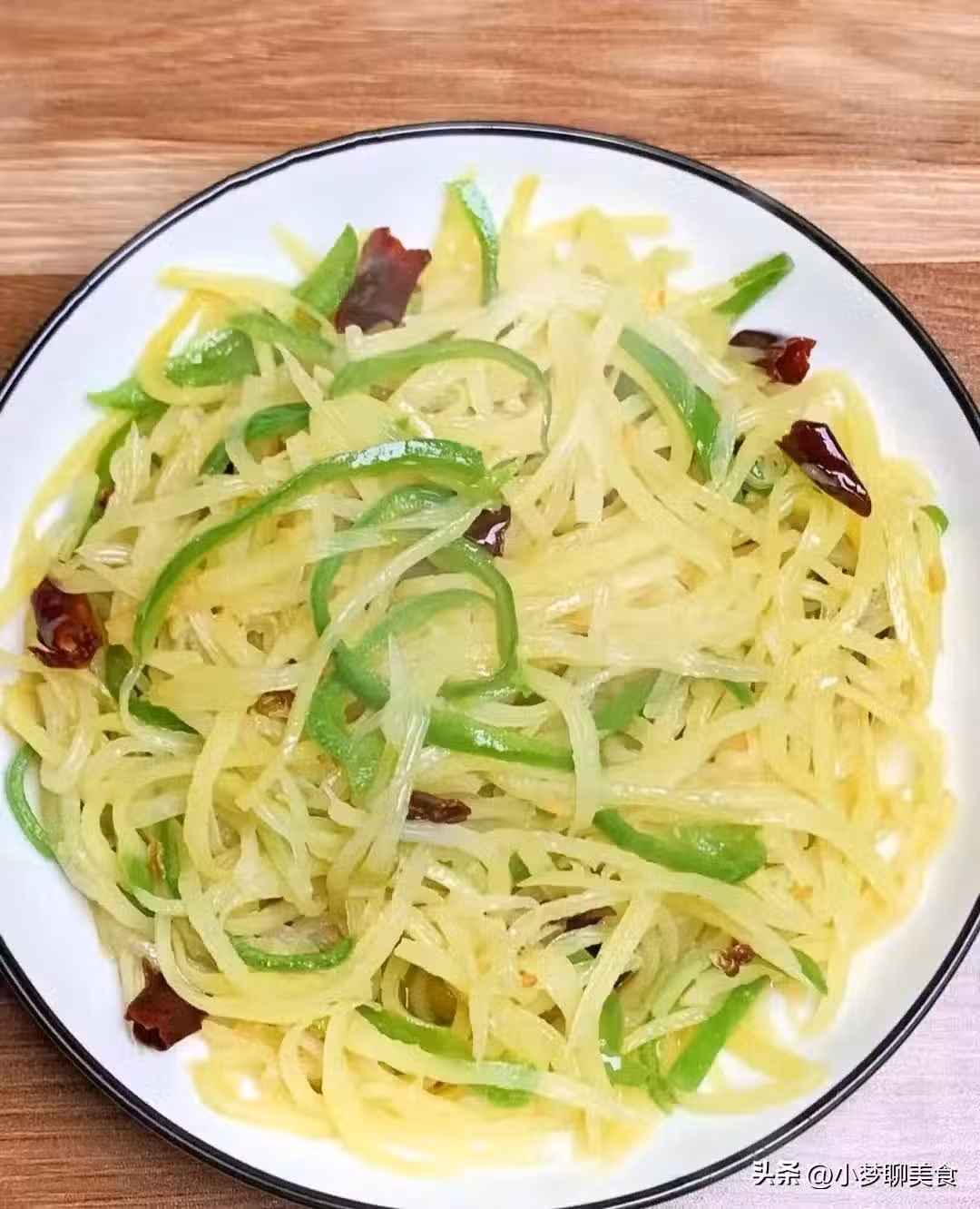 ②油熱下入干辣椒、花椒、蔥姜爆香。下入土豆絲大火快速翻炒變色,再倒入青椒絲炒至斷生。放一勺鹽,一勺雞精,翻炒均勻出鍋。