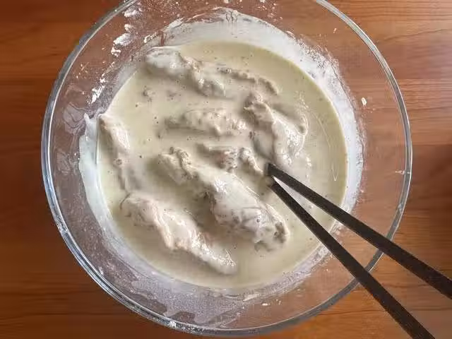 5、油溫加熱至放進筷子冒泡泡,放入雞翅中小火慢慢炸,先不要翻動,定型之後再翻受熱更均勻,炸至表面微微發黃,撈出來,油溫升高,放進去二次復炸,炸至金黃色撈出來控油;