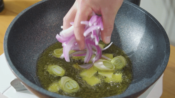 鍋內加菜籽油,燒熱後加入大蔥,洋蔥煸炒幾下。