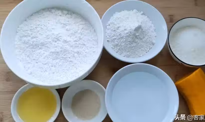 食材準備:南瓜1塊250克,白砂糖150克,麵粉150克,糯米粉350克,玉米油30克,酵母粉6克,溫開水220克。