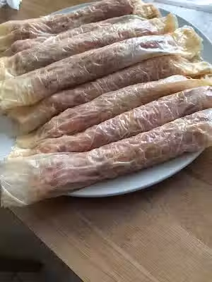 5)把一塊新和清潔的布弄濕然後抹在豆腐皮上,拿4-5 條的肉放在豆腐皮的邊邊,捲起來,然後輛頭邊用水壓扁