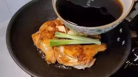 6.下入準備好的蔥薑等輔料,再淋入準備好的調料汁,調料汁要比雞腿肉稍高一些,煮開後蓋上鍋蓋,轉成小火燉15分鐘。