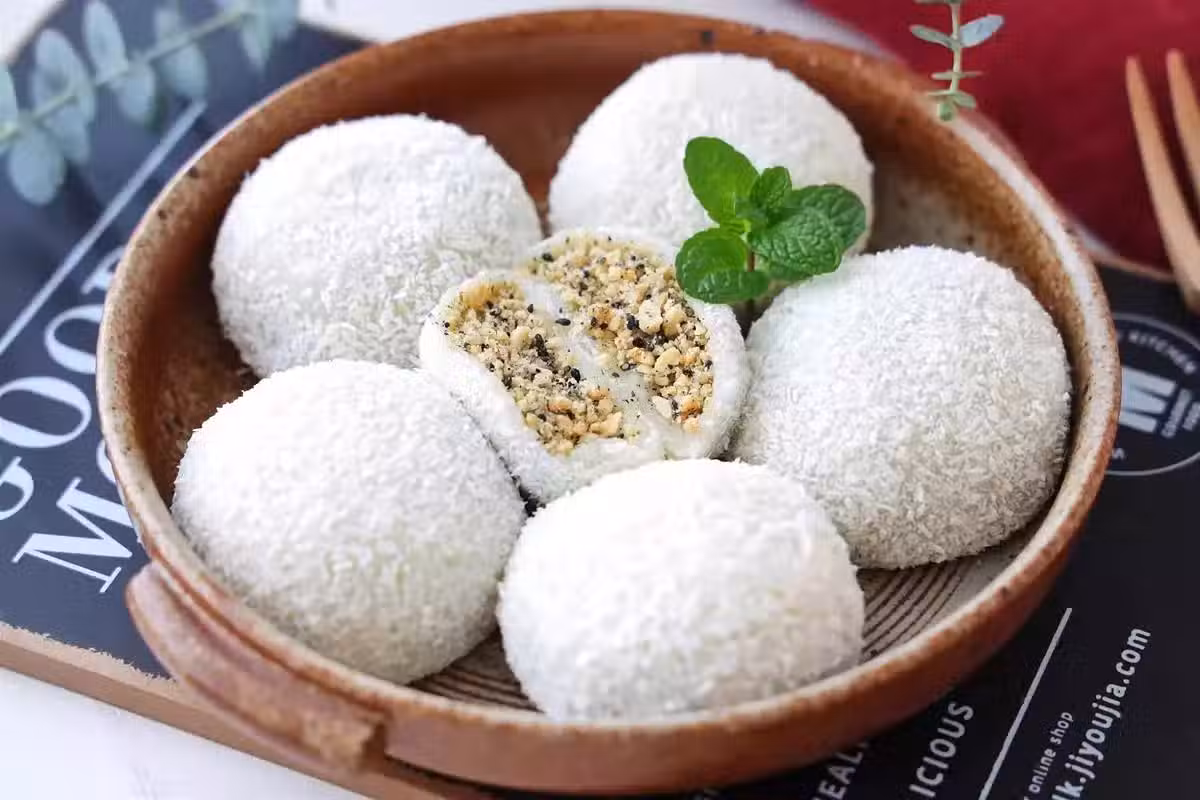6、再放在椰蓉碗裡,裹上一層椰蓉;我們的花生糯米滋就做好了,軟糯香甜,餡料越嚼越香。