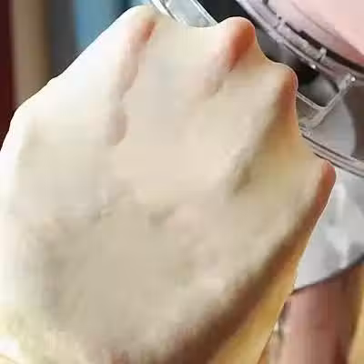 4、2分鐘後,揪一小塊麵團,輕鬆拉出手套膜。也就是說,只需要8分鐘,就能夠輕輕鬆松拉出手套膜,非常簡單。