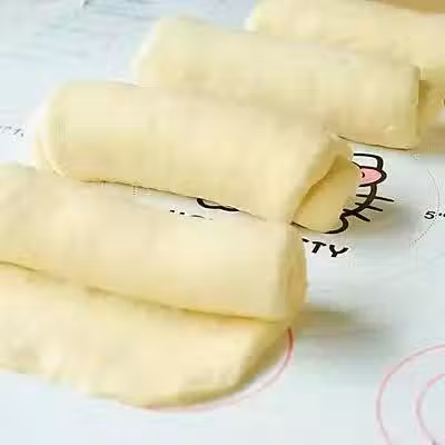 7、擀成長條狀,自上而下捲起來,蓋上保鮮膜再次靜置10分鐘。