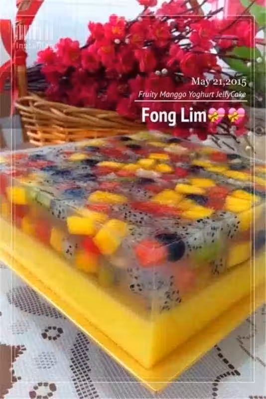 2. 將(B)材料,放進鍋裡,攪拌均勻,煮滾,先將1/3 燕菜汁,倒在芒果層上,分兩次鋪上切丁水果,交叉將燕菜汁倒完。