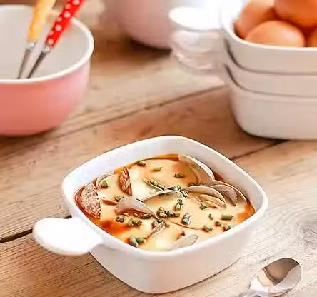 3、雞蛋打散,加入精鹽10克、味精、紹酒各5克、色拉油15克、溫高湯2杯和花蛤湯汁攪拌均勻後,取濾網過濾於深碗中,覆上微波薄膜,中火4分鐘。