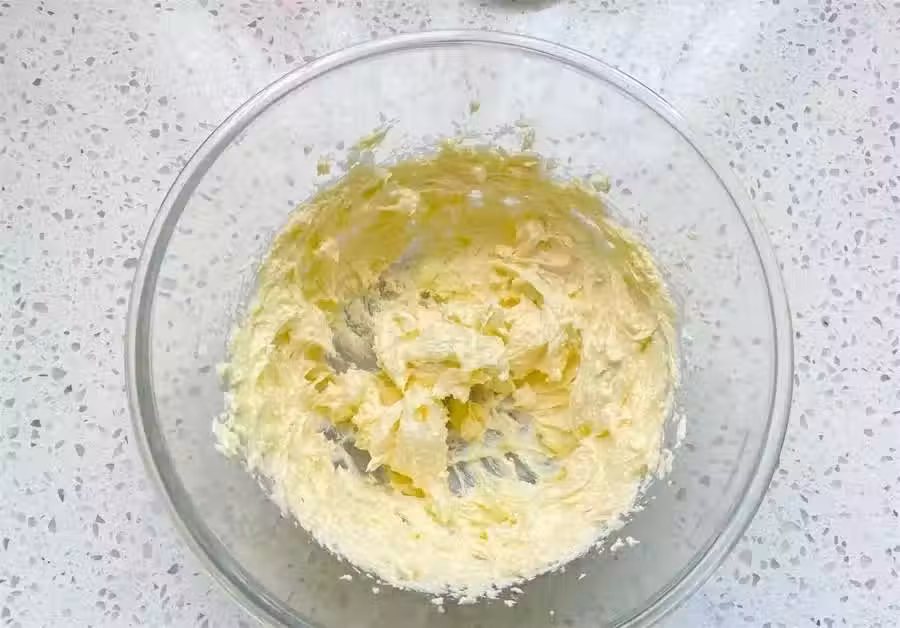 5、用粉篩把低筋麵粉,篩入黃油霜裡,用刮刀翻拌至無乾粉。
