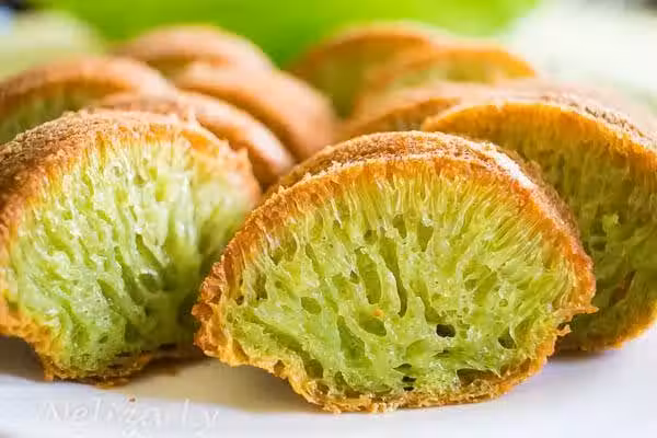 食材:班蘭精1/2湯匙,椰奶200g、粘米粉2小匙、木薯粉2杯、泡打粉2又1/2小匙、沙拉油2小匙、香草精1小匙、雞蛋6粒、糖3/4杯