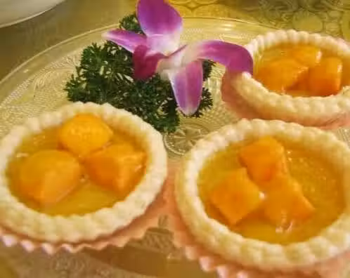 1.芒果去皮切丁,牛奶倒入碗內,加適量的煉乳,加適量的白糖,邊煮邊攪拌至白糖溶化,待牛奶涼至室溫,倒入蛋黃液,倒入適量的麵粉攪拌至無顆粒就是蛋撻水了,蛋撻皮內放入芒果丁,倒入蛋撻水。