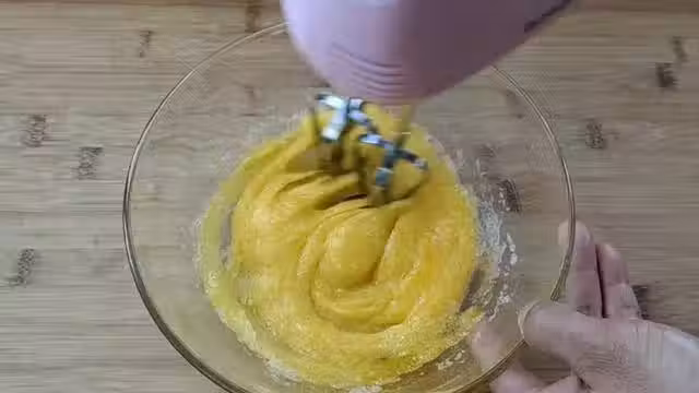 盆里再加入玉米油,用打蛋器繼續攪打一分鐘,充分乳化。然後加入麵粉。麵粉用中筋低筋都行。攪拌均勻,最後是中等軟硬狀態的麵糰。稍微揉一會兒,揉到光滑。